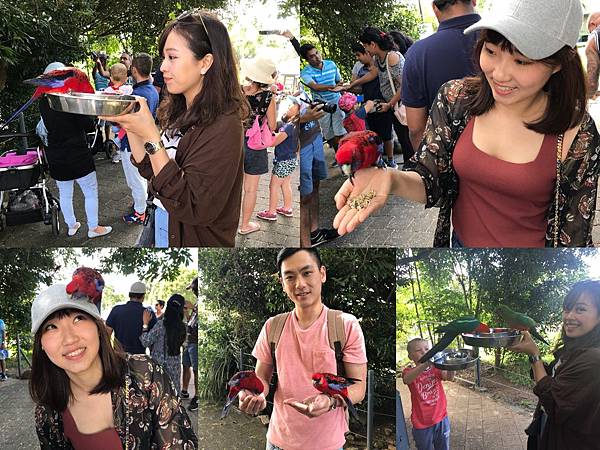 店員告訴我們別送手餵,但來到住滿鸚鵡的樹下發現大家根本沒在管,